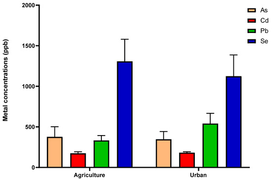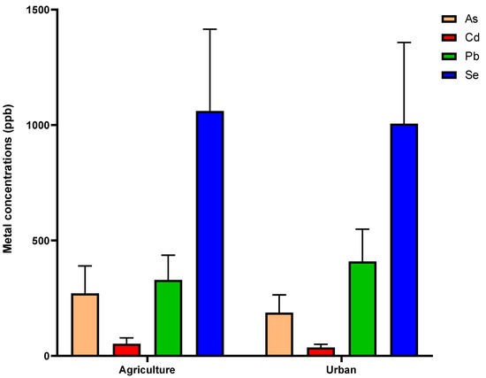 Differences were observed in the concentrations of the heavy metals (As, Pb, and Cd) and Se detected in pollen samples collected from the agricultural versus urban areas. The mean concentrations of Se and As detected in the pollen samples were 1.16 and 1.08 times higher in agricultural sites than they were in urban sites. The mean concentrations of Cd and Pb detected in pollen samples were 1.04 and 1.62 times higher in urban sites than they were in agricultural sites. Table 1 summarizes the statistical data of the heavy metal concentrations in pollen samples collected from hives in agricultural and urban areas.