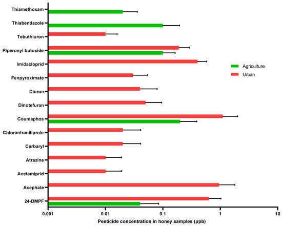 Twenty-one honey samples were collected from hives located in urban versus agricultural landscapes and analyzed for 92 different pesticide residues. Seventy-six pesticide types were not detected in honey samples or were less than the limit of quantitation. However, sixteen chemicals were detected in honey samples, nine of which were insecticides, three were herbicides, two were fungicides, one was an acaricide, and one was a pesticide synergist. Coumaphos, Piperonyl butoxide, and Tebuconazole were observed at the highest concentrations in honey samples collected from agricultural areas, with mean concentrations of 0.22, 0.11, and 0.11 ppb, respectively. Coumaphos, Acephate, and 2,4-DMPF were observed at the highest concentrations in honey samples collected from urban areas, with mean concentrations of 1.09, 0.93, and 0.64, respectively. Figure 4 shows the means and standard errors of mean of different pesticide concentrations (ppb) found in honey samples collected from urban and agricultural areas. Overall, no significant variation in pesticide concentrations was observed in honey samples collected from urban and agricultural areas (all with p > 0.05).