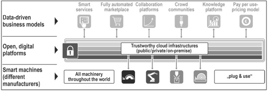 The business model describes the product or service that a market participant offers and the characteristics of how it interacts with customers and suppliers [17]. At its core are (1) a unique value proposition; (2) a revenue model or revenue mechanism that describes how the value of the offering can be converted into revenue; and (3) the resources and processes used to deliver the value proposition [18,19]. The key resources are brand, people, technology, partnerships, and data. In the digital age, data amount to a key resource for implementing a company’s value proposition in the form of intelligent, networked products and services, as well as digitized organizational, development, production, and logistics processes.