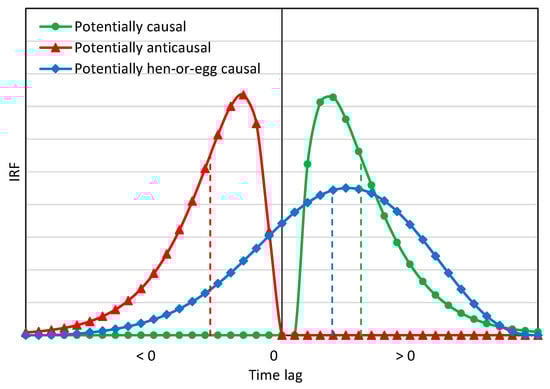 The methodology in [,] is based on the impulse response function (IRF) between two processes , denoted as where denotes time lag, based on the convolution