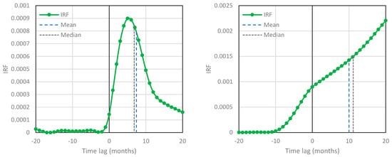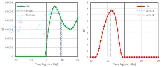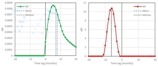 IRFs for temperature–CO2 concentration based on the NCEP/NCAR Reanalysis temperature at 2 m and the South Pole time series, respectively—case studies #14 (left; ; potentially causal system) and #15 (right; ; potentially anticausal system).