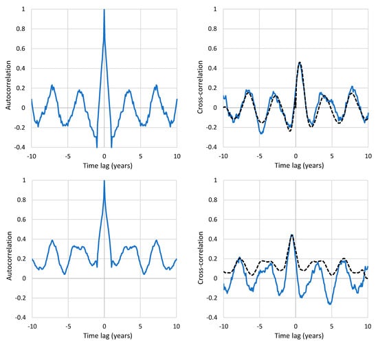 Thus, can be estimated from the IRF and the empirical from the data. Figure 4 shows the autocorrelation and cross-correlation functions (which are covariances standardized by standard deviations). For the case (i.e., case study #3; upper panels of Figure 4), the reconstructed cross-correlation function, calculated from the IRF (seen in Figure 2) and the empirical autocorrelation function of temperature (seen in the upper left panel of Figure 4) using the discretized version of equation (7), agrees well with the empirical function for time lags up to ±10 years, i.e., spanning 20 years (1/3 of the series length). As time lag has an equivalence relationship with timescale [], we may conclude that the potential causality relationship detected is valid for timescales of two decades. For comparison, the lower panels of Figure 4 show the reverse case, , (case study #4), where there is no longer good agreement between empirical and reconstructed cross-correlation, which provides additional support for the claim that the true causality link is .