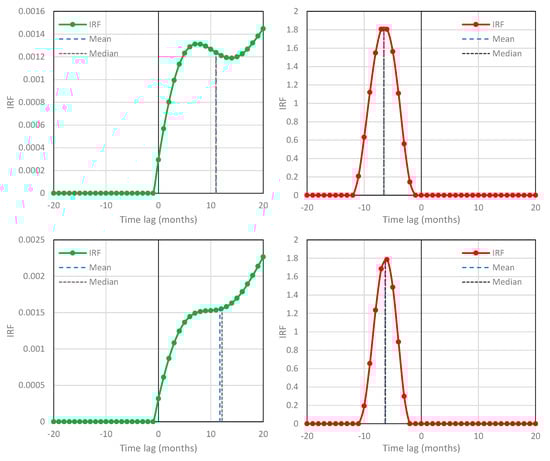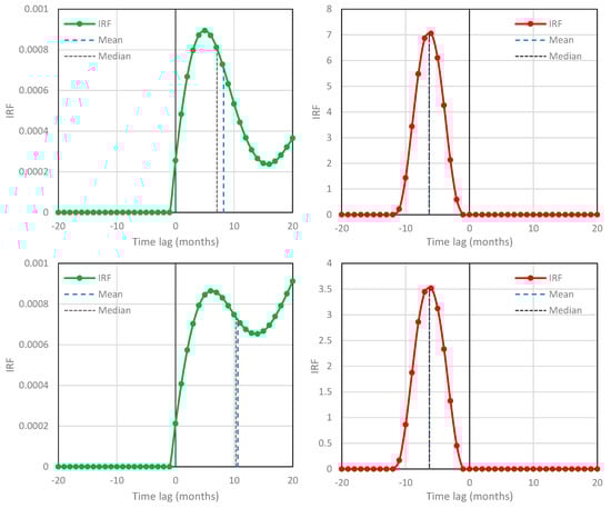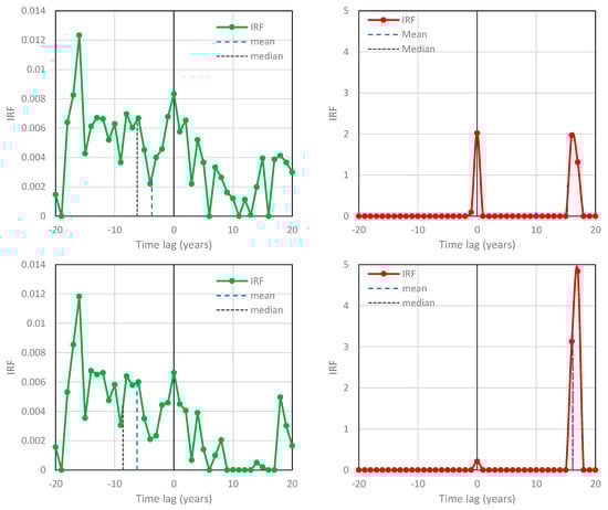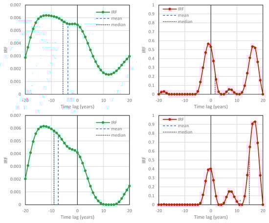 IRFs for temperature–CO2 concentration based on the NCEP/NCAR Reanalysis temperature at 2 m and Mauna Loa [CO2] time series, respectively—case studies #3 (left; ; potentially causal system) and #4 (right; ; potentially anticausal system).