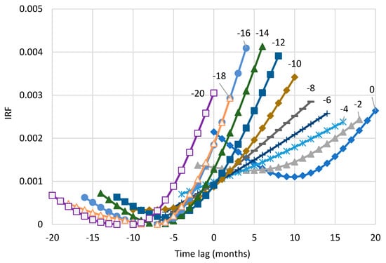 IRFs for temperature–CO2 concentration based on the NCEP/NCAR Reanalysis temperature at 2 m and Mauna Loa time series, for 21 time lags, differencing time step of 16 years and direction . The lowest nonzero lag of each IRF is marked at the upper-right end of its curve.