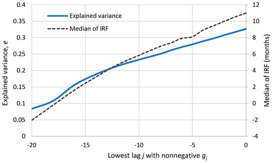 Arguably, it is more reasonable in this case to change from a symmetric to a non-symmetric window of time lag. Hence, we use a window of length 21 and slide it so that the lowest nonzero time lag vary from to 0. Only the case where this is 0 denotes a potential unidirectional causality, where all 20 other cases correspond to potential HOE causality. The resulting IRFs are plotted in Figure 7, while the fraction of explained variance is plotted in Figure 8 as a function of the lowest nonzero time lag. It may be noticed that the curve for the lowest time lag 0 is different from Figure 5 (bottom left). In particular, the ordinate at 0 is higher in Figure 7, thus producing a concave shape of IFR. This is a result of the fact that the window length is fixed, while the lowest ordinate no longer contributes to the roughness (no second derivative can be determined for the lowest point and thus the algorithm can increase the ordinate at 0 at no cost). In turn, the explained variance further increased to 0.327.