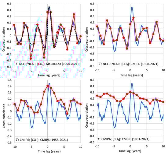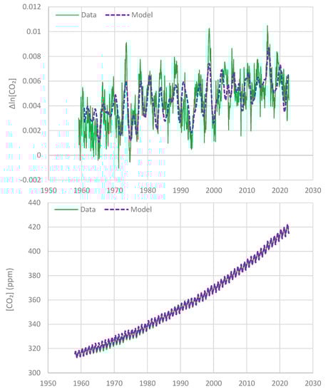 The longest time series of systematic [CO2] measurements is that of Mauna Loa, which began in 1958. The global temperature at 2 m of the NCEP/NCAR reanalysis series goes back to 1948 and thus allows studying the T-[CO2] relationship for the period 1958–2022 (two additional decades of data in comparison to those studied in []).