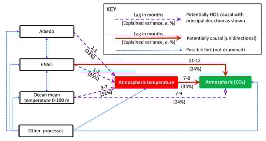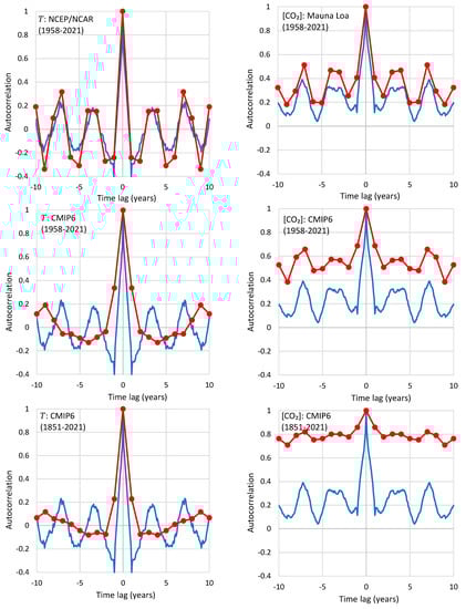 In terms of its applications, the study used global temperature data from satellites (University of Alabama in Huntsville—UAH) and ground-based (CRUTEM.4.6.0.0 global T 2 m land temperature) and [CO2] data at several sites (Mauna Loa, HI, USA; Barrow, AK, USA; South Pole; global average) with monthly time steps for the period 1980–2019. An innovative element of this study was that it explained the reasons why using the original T and [CO2] data series yielded spurious results, and it proposed using the changes (differences in time) thereof instead. We note that differencing is of very common use in economics literature (e.g., [,]). In particular, for the [CO2] it proposed taking the logarithm before differencing (something resembling techniques used in economics []) and thus the time series that were correlated were and , where the differences are taken over 12 months. By studying lagged correlations of the two, the study asserted that, while both causality directions exist, the results support the hypothesis that the dominant direction is T → CO2. Changes in [CO2] follow changes in T by about six months on a monthly scale or about one year on an annual scale. In turn, the study attempted to interpret this mechanism by referring to biochemical reactions, since at higher temperatures soil respiration, and hence CO2 emission, increases.