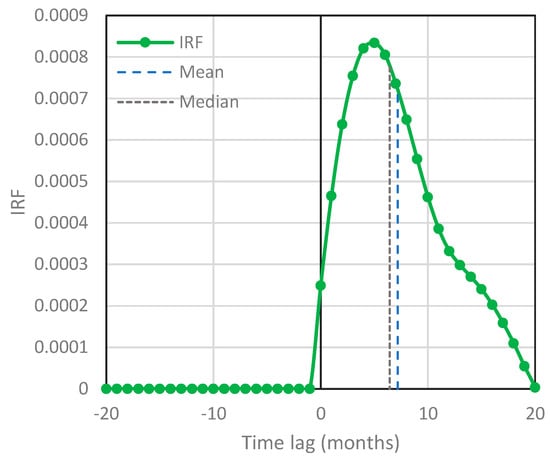 A characteristic pattern is that, as the time step increases, so does the rightmost ordinate of the IRF, . This behavior, i.e., the increasing limb of beyond some time lag, has been explained in [] and is an artifact of an insufficient (small) window of time lag for determining IRF. Thus, it suggests that a higher should be used. It is quite reasonable to expect that if the differencing time step increases, so should the window size do. In particular, it is interesting to observe that in the lowest panel of Figure 5, corresponding to a differencing time step of 16 years, while the time window of IRF is only 40 months (a little more than 3 years), the IRF is a monotonously increasing function. Apparently, this is an artifact due to the too small window of time lag. In such a case, it is also reasonable to expect some nonnegative estimates of IRF ordinates for negative lags, even if the system is unidirectionally causal. Indeed, this has appeared in the case of a differencing time step of 16 years, even though the lowest panel of Figure 5 shows the purely unidirectional version of the IRF. This may create some ambiguity in the identification of causality, which we analyze and resolve in the next section.