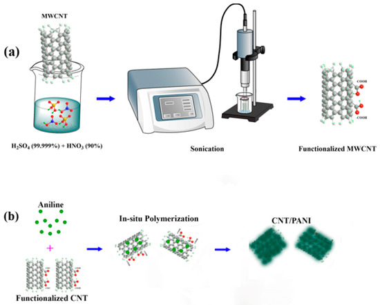 (a) Schematic of the process of functionalizing CNTs. (b) In situ polymerization of CNT/PANI.