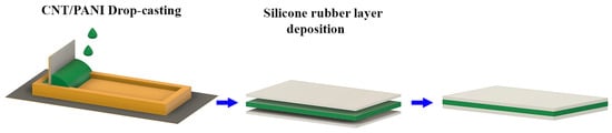 To obtain excellent electrical and mechanical properties, we incorporated CNTs in a robust polymer matrix of PANI, known for its exceptional conductivity, and silicone rubber to enhance the composite’s stretchability. The CNTs used in the study were multi-walled with a purity level exceeding 95% and a surface area of 450 m2/g obtained from Platonic Nanotech (US Research Nanomaterials, Inc., Houston, TX, USA). Other materials, including aniline with a purity of more than 99.5%, ammonium peroxoydisulfate (assay ≥ 98.0% (iodometric)), nitric acid (ACS reagent, ≥90.0%), sulfuric acid (assay 99.999%), and hydrochloric acid 37%, were obtained from Merck (Merck Pte. Ltd., Darmstadt, Germany).