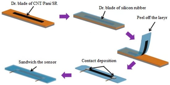 The schematic of the process for making a strain sensor containing CNT/PANI/silicone rubber material.