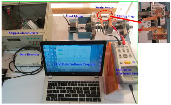 The strain sensor’s performance parameters were evaluated using a designed test setup. Electrical connections between the sensor’s connection pads and an LCR meter (inductance (L), capacitance (C), and resistance (R)) (GW Instek 916) were established by securing the pads to two clamps with electrical terminals. One clamp remained stationary, while the other clamp was connected to a lead screw, which received commands from a stepper motor driver (Figure 5). During the application of strain, a software program associated with the LCR meter was utilized to plot the resistance change graph. The setup allowed for adjusting various parameters such as strain rate, speed of the movable clamp, and the number of cycles. By employing this setup, precise control over the testing conditions was achieved. The acquired data were subsequently imported into MATLAB software, enabling the extraction of performance parameters for the strain sensor.