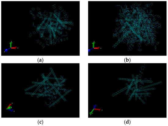 VMD graphical environment for different percentages of CNT/PANI composites. (a) (20% CNT −80% PANI), (b) (40% CNT −60% PANI), (c) (60% CNT −40% PANI), (d) (80 CNT −20% PANI).