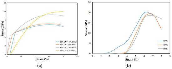 (a) Stress–strain graph for the CNT/PANI nanocomposite with different weight ratios (CNT to PANI (20/80), (40/60), (60/40), and (80/20)). (b) Stress–strain graph for the CNT/PANI nanocomposite at three different temperatures (300 °K, 325 °K, and 350 °K).