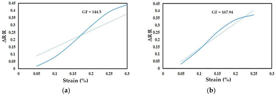 The performance parameters of the strain sensor were obtained by analyzing the resistance and length data generated by the applied force. This analysis involved evaluating the changes in electrical resistance and calculating the gauge factor based on the slope of the graph depicting the relationship between relative resistance changes () and strain. Figure 8a,b illustrates the relative changes in resistance corresponding to strain for the CNT/PANI sample and CNT/PANI/silicone rubber sample, respectively. As the applied force and the length of the strain sensor increased, its resistance also increased. The behavior of the strain sensor exhibited linearity within the range of applied strain.