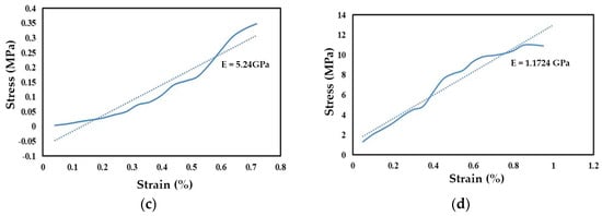 The stress–strain graphs shown in Figure 7a clearly present the effect of varying PANI weight ratios on the composite’s behavior. Increasing PANI content led to a decrease in the elastic region and load-bearing capacity, while a weight ratio of 40/60 (CNT/PANI) resulted in plastic behavior at higher strains. This result underscores the importance of carefully selecting the weight percentage of PANI and CNT to achieve the desired mechanical characteristics. The selection of the 40/60 weight ratio for CNT/PANI composites as the optimum one is considered to balance mechanical behavior and conductivity.