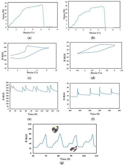 (a) Applied force versus strain on CNT/PANI sample. (b) Applied force versus strain on CNT/PANI/silicone rubber sample. (c) Hysteresis curves (electrical resistance versus strain) for CNT/silicone rubber sample. (d) Hysteresis curves for CNT/PANI/silicone rubber sample. (e) Drift diagrams of CNT/PANI sample. (f) Drift diagrams of CNT/PANI/silicone rubber sample. (g) Resistance versus time graph of a strain sensor based on CNT/PANI/silicone rubber connected to a hand.