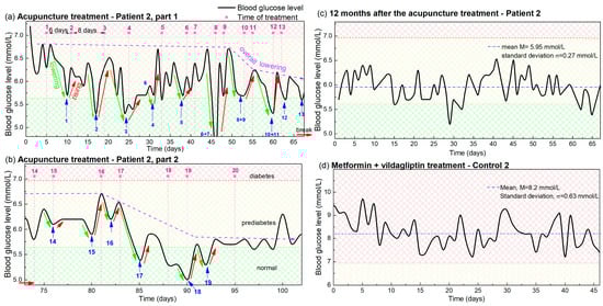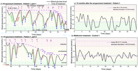 (a,b) Blood glucose levels during acupuncture as function of time for Patient 1. The days in which the acupuncture was received are indicated by vertical pink dashed lines, while the pink numbers above them indicate the number of the already applied treatments. Blue arrows and numbers indicate the minima of the glucose level that appear after each acupuncture treatment and the number of the applied treatments. The lowering and rising effects are denoted by green and red arrows. The overall lowering effect is indicated by dashed violet arrows. The small, red horizontal arrow indicates the break in the acupuncture due to COVID-19. Normal, prediabetes and diabetes BGL are indicated by green-yellow and red patterns (color areas). (c) BGL for Patient 1 controlled 1 year after the acupuncture treatment. (d) BGL during metformin-based treatment of Control 1 with a similar disease history. The average BGL value is indicated by horizontal blue line.