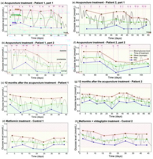 Analysis of the measured BGL, including maximal, average and minimal values of BGL during the acupuncture or drug treatment. (a–d) Patient 1 and Control 1, i.e., analysis of the measurements from Figure 1. (e–h) Analysis of the BGL values for Patient 2 and Control 2, i.e., the measurements from Figure 2. The measurements taken for the analysis are indicated by light gray lines. Maximal value is indicated by red, average by green, and minimal value by the blue line and symbols. The averaging and determination of the maximal and minimal glucose levels are performed over a time interval that included two acupuncture treatments or seven days of taking the drug-therapy. The time of acupuncture treatment is indicated by vertical dashed pink lines. Normal, prediabetes and diabetes BGL are indicated by green-yellow and red patterns (color areas).