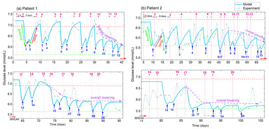(a,b) Measured and simulated BGL for Patient 1 and Patient 2, respectively. Experimental data (green line with symbol) and simulations obtained using the best-fit parameters (full light blue line). Pink numbers and vertical dashed lines indicate the order number of the applied treatment, while the blue numbers and arrows indicate the corresponding number of the BGL minima. Different times between the two treatments are applied for Patient 1 and Patient 2 (indicated for the first three treatments), resulting in different shapes of the BGL curves. The lowering, rising and overall lowering effects (indicated by green, red and violet arrows respectively) are clearly visible in both the experimental and modelled curves.