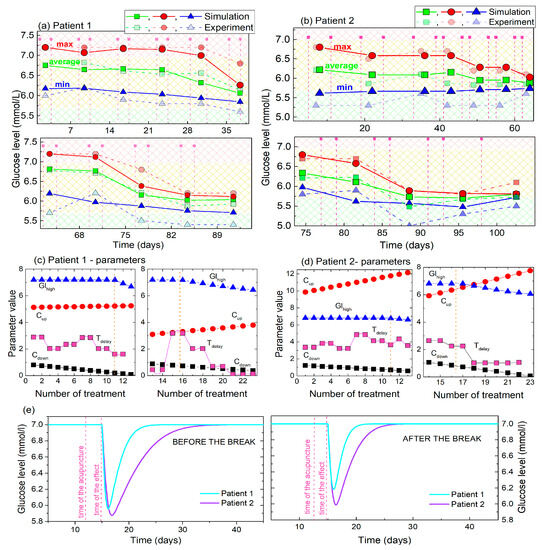 The main properties (maxima, average, minima) of the experimental and simulated BGL curves for Patients 1 and 2, as well as the parameters obtained by the fits are given in Figure 7. The maximal, minimal and average values for Patients 1 and 2 are compared in Figure 7a and b, respectively. It follows that the main properties of the simulated curves are very similar to the experimental curves, especially the maximal and average values, for both patients. The minima of the simulated curves are slightly higher than the experimental, probably due to the limitations of the functions used for the description. We intentionally use simple functions that can be easily used by non-experts. In addition, it is important to note that the maximal and minimal values are strongly affected by the random fluctuations of the experimentally measured BGL, while they are not included in the model. Therefore, for example, the last maximal value of the experimental curve deviates from the modelled one in Figure 7b. Interestingly, for both patients the overall lowering effects starts after the 10th treatment, and becomes obvious after the 14th treatment what will be discussed later in the text.