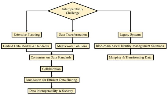 The use of blockchain-based identity management solutions may improve data security and interoperability [51]. These systems provide a safe basis for data transmission by discretely handling patient identities and access rights. The integration process is also made easier by systems that can map and translate data from diverse sources into a uniform format for blockchain [52]. Planning, data transformation, standards consensus, middleware solutions, cooperation, and identity management are just a few of the strategies shown in Figure 2 for overcoming interoperability issues in healthcare blockchain integration.