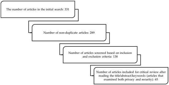 The Scopus database was used to find the study data. Scopus is recognized as one of the most thorough databases, and its dataset includes some of the most reliable literature. In this research, publications about blockchain, security and privacy, and healthcare were searched for and further examined on 14 March 2023.