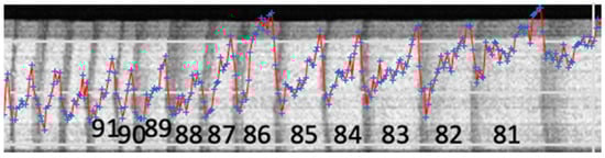A fragment of an X-ray image showing the time span (tree rings) included into the analysis. Black numbers from 81 to 91 denote years of the rings’ growth, i.e., from 1981 to 1991. The blue markers denote the levels of Ca count rates, while the red line connects them for visibility.