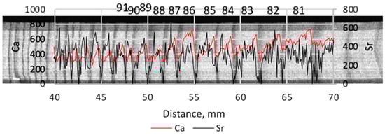 Another remarkable pair of elements are Ca and Sr. They are considered to be geochemical analogs of each other because Sr often replaces Ca in minerals as well as in living tissues. The ion Ca2+ has the radius 0.1 nm while Sr2+ has the radius 0.118 nm which is somewhat larger but more or less close to the former to provide similar properties. Calcium variates consistently between early- and late-wood (Figure 3) growing in the very beginning of the growth season and falling around the start of late-wood formation. This type of behavior has been found in a number of studies [,].