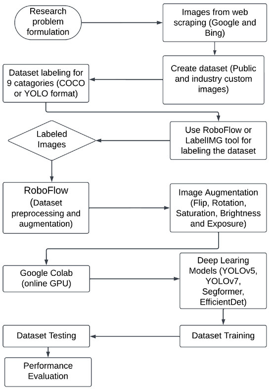 In this work, a robust algorithm for identifying industrial and street pollutants, including wires, billboards, bricks, street litter, fabric rubbish, industrial dye, and industrial billboards, categorizing visual contaminants associated with the textile industry, has been developed. Figure 5 illustrates the functional flowchart of the proposed PC-based software system. As depicted in Figure 5, we initially compiled nine categories of visual pollution images to train a model capable of performing various tasks. These categories will be used to train our model to recognize the different types of pollution present in those images and to learn the common characteristics within each image. To create a diverse dataset, we aggregated photos from search engines, various textile factories, and local streets in Bangladesh. After acquiring raw images, we utilized LabelImg to annotate the photographs. Subsequently, Roboflow was employed for the artificial preprocessing and enhancement of the images. Finally, the YOLOv5, YOLOv7, SegFormer, and EfficientDet deep learning models were utilized for the categorization of the visual pollutants.
