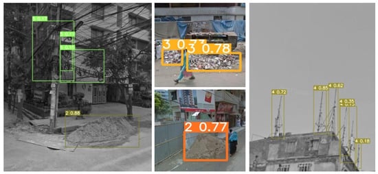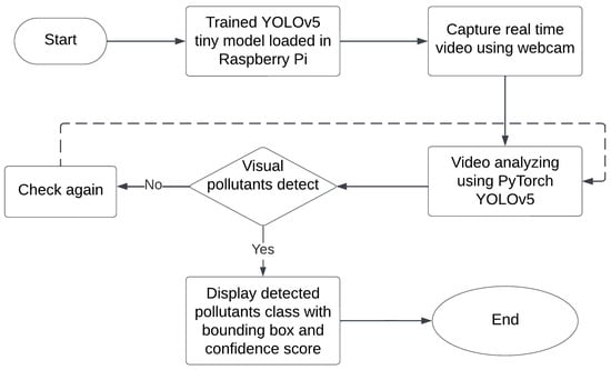 The Raspberry Pi 4B, webcam, and YOLOv5 model are initialized. Following the training of the proposed YOLOv5 model with various visual pollutants, it is deployed on the Raspberry Pi 4B. The webcam captures a live video feed, which is then processed through the YOLOv5 framework for the detection and classification of visual pollutants. Subsequently, the detected pollutants are labeled, and their corresponding confidence scores are obtained. Working sequences of the proposed Raspberry Pi 4 and YOLOv5-based visual pollution detection hardware system are demonstrated in Figure 6.