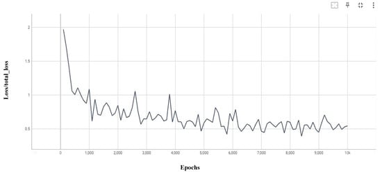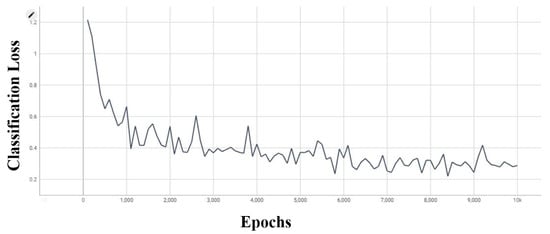 The classification loss function works as a measure of dissimilarity between the predicted probabilities and the actual labels. A lower classification loss corresponds to higher accuracy. As shown in Figure 7, after 10,000 epochs, we achieved a classification loss of 0.3. Additionally, across an average of 2000 to 10,000 epochs, the classification loss ranged from 0.2 to 0.4.