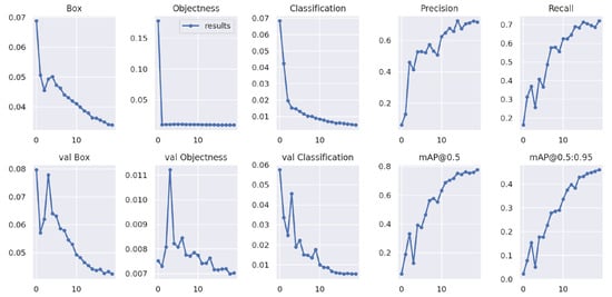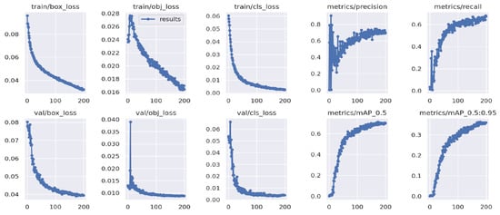 For the YOLOv5 model, the employed dataset utilizes an average amount of GPU RAM. Classification losses show a significant decrease as training progresses. Figure 10 illustrates the training and validation classification losses of the YOLOv5 model over epochs. It is noteworthy that, at 200 epochs, we achieve the highest accuracy of 0.712 and the highest recall of 0.91. Figure 10 represents all performance metrics obtained with the YOLOv5 model.