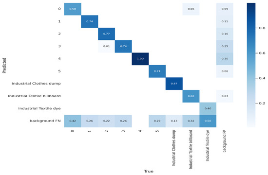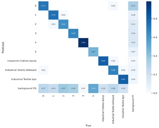 The normalized confusion matrix, representing the performance of the YOLOv5 model across the nine visual pollution categories, is illustrated in Figure 11. According to this figure, the YOLOv5 model achieved the highest accuracy in detecting the tower pollutant category. In contrast, it recorded the lowest accuracy for the entangled wire class.