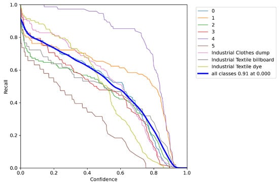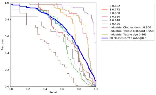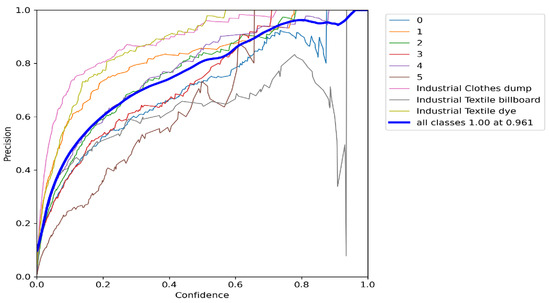 According to Figure 13, it is evident that all classes achieve a precision of 1.00 at a confidence threshold of 0.961. This scenario signifies that the model is highly accurate and confident in detecting all classes of objects at that threshold, effectively eliminating false positive errors, which are bounding boxes that do not match the ground truth labels. A higher confidence threshold indicates that the applied model is precise and confident in its predictions.
