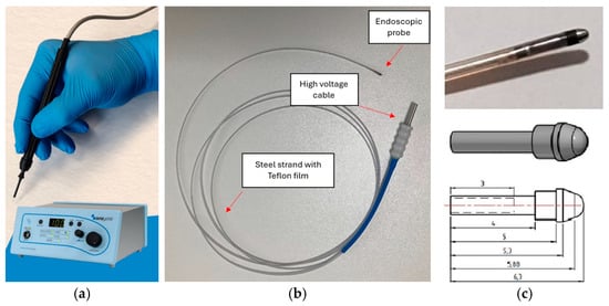 Cold plasma technology showcased in surgical applications: (a) Oneyonis® device and scalpel (courtesy of Otech Industries Srl); (b) surgical probe for endoscopy, comprising a functional terminal part, steel-made electrical cable, and a high-voltage connector; (c) probe details.