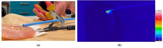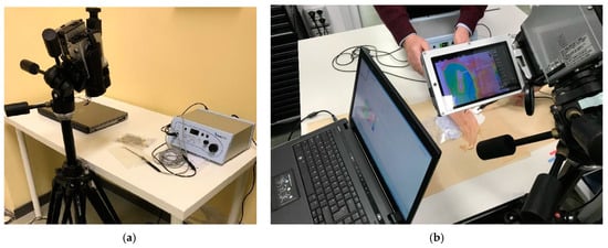 Thermographic measurements: (a) test equipment with a thermal camera and cold plasma surgery equipment; (b) a moment of the experiment, showing the detected thermographic image.