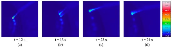 Thermographic images showcasing temperature fluctuations at various stages of the experiment, with Tmax reaching approx.: (a) 380 °C during plasma activation; (b) 120 °C shortly after deactivation; (c) 160 °C during a subsequent phase; and (d) 140 °C at a later moment.