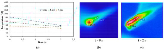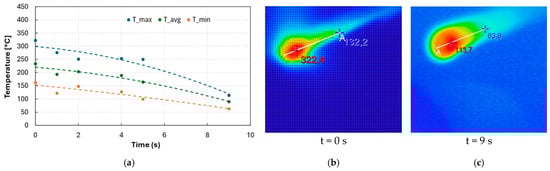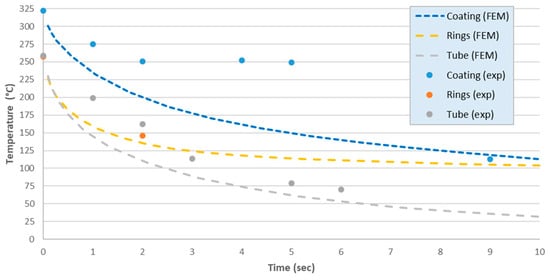 Results are displayed in Figure 8. Due to the better insulation, Tmax moves from 639 °C (uncoated) and 322 °C (coated) to 257 °C. Moreover, during the cooling phase, it went down to 150 °C (−41%) after just 2 s (Figure 8b,c).