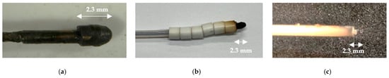 To verify this observation, the test with the insulation tube considered minor geometric changes to minimize the exposed part. Operationally, this involved machining the terminal part of the probe, removing the Teflon film, and inserting the capillary tube so that the probe now protruded less than 0.5 mm from the ceramic tube. All lateral discharges ceased, confirming it as the most effective technical solution to the issue (Figure 9c).