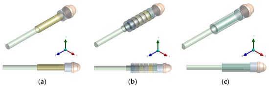 Systems under FE discretization, i.e., the probe with: (a) 1 μm coating; (b) rings (600 μm); (c) tube (400 μm).