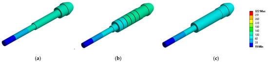 Steady-state thermal (SST) analysis reporting the thermal state when the plasma is turned off in the case of the probe: (a) with coating (1 μm); (b) with rings (600 μm); (c) with tube (400 μm).