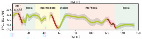 Evolution of the stable carbon isotope ratio over the last glacial cycle derived from ice cores drilled in Antarctica according to []. The mean ratios are shown as a green line with an enhancement in red during the major phases of warming. There is one gap in the reconstruction where the data between the cores deviate notably. Marine Isotope Stages are color-coded in the glacial, interglacial, and intermediate periods.
