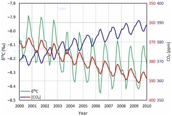 Mauna Loa data of δ13C in atmospheric CO2 and atmospheric CO2 during the decade from 2000 to 2010. The figure is modified from Figure 7 in Koutsoyiannis []. The green and red curves are digitized from the original, but with the y-axis for CO2 in concentrations rather than as reciprocal values (numbers in red); the blue curve is identical to the red one but inverted according to the commonly used notation with increasing y-axis units (numbers in blue).