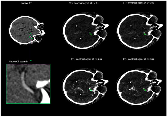 NCCT and CTA were resampled to a uniform 512 × 512 × 240 matrix size with 0.5 × 0.5 × 0.8 mm resolution, and CTA was co-registered to the NCCT volume using dipy (www.dipy.org, accessed on 1 August 2024) [29]. To minimize the influence of patient motion during the acquisition of the CTP on the analysis, the time-resolved CTP images were co-registered to the first image of the CTP series.