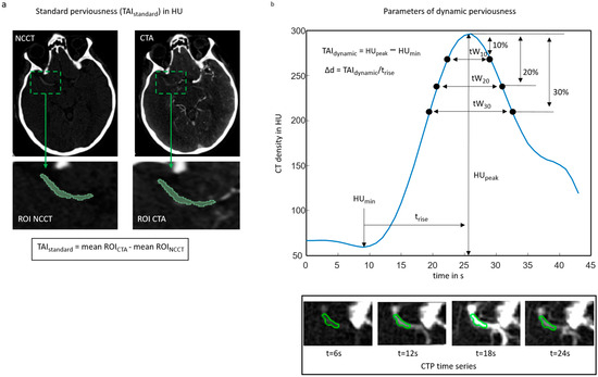 The computation of (a) standard and (b) dynamic perviousness. Region of interests (ROIs) covering the entire thrombus on a 2D transversal slice were manually drawn in 3D Slicer (www.slicer.org, accessed on 1 August 2024) [30] by considering the hyperdense artery sign. The time-resolved contrast agent uptake (CAU) curve in (b) was determined by computing the mean thrombus density within the ROI for each imaging time point of the CTP time series.