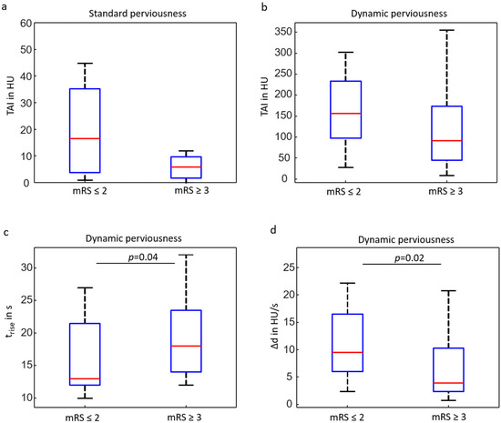 A good clinical outcome after reperfusion therapy was defined as an mRS below three at 90 days after therapy (good outcome: mRS3months ≤ 2; poor outcome: mRS3months ≥ 3). Patients were divided into two groups: mRS3months ≤ 2 and mRS3months ≥ 3. TAIstandard, TAIdynamic, trise, ∆d, tW10, tW20, and tW30 were analyzed for their association with mRS3months with the two-sided Wilcoxon–Mann–Whitney test in Matlab. For p-values less than 0.05, differences were considered as significant.