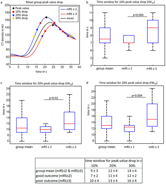 Statistical analysis of the group mean time windows for the CAU peak value concentration and their associations with the clinical outcome. (a) Group mean CAU curve and corresponding tW10 (red dots), tW20 (blue dots), and tW30 (yellow dots) for mRs ≤ 2, mRs ≥ 3 and mean (including all patients), respectively. The group mean times were 9 ± 3 s, 12 ± 4 s, and 14 ± 3 s for tW10, tW20, and tW30, respectively. Thrombi with good clinical outcomes had significantly narrower time windows with the CAU peak than thrombi with poor outcomes (tW10: 7 ± 2 s vs. 10 ± 4 s, p = 0.004, tW20: 11 ± 4 s vs. 13 ± 4 s, p = 0.02, tW30: 12 ± 2 s vs. 16 ± 4 s, p = 0.004, b, c, d, respectively). p-values between mRS ≤ 2 and mRS ≤ 3 were computed with the two-sided Wilcoxon–Mann–Whitney test in Matlab.