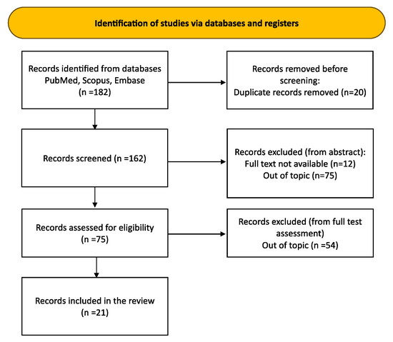 An initial systematic exploration of databases such as Medline, PubMed, and Scopus was undertaken. Publications without a limit on the timeframe were selected. The following set of search terms were included: Pathological number of vessels in the umbilical cord OR Single umbilical artery OR Four vessels umbilical cord AND Perinatal outcomes OR Fetal malformations OR Chromosomal abnormalities (Title/Abstract). Following the removal of duplicate entries, the authors proceeded with a preliminary review of titles and abstracts to evaluate their alignment with the review’s objectives. This preliminary phase involved sifting through titles and abstracts, culminating in the selection of 21 pertinent articles (Figure 1). These chosen studies form the bedrock of a narrative review designed to dissect and elucidate the nuanced impacts that anomalies in umbilical cord vessel count exert on perinatal outcomes.