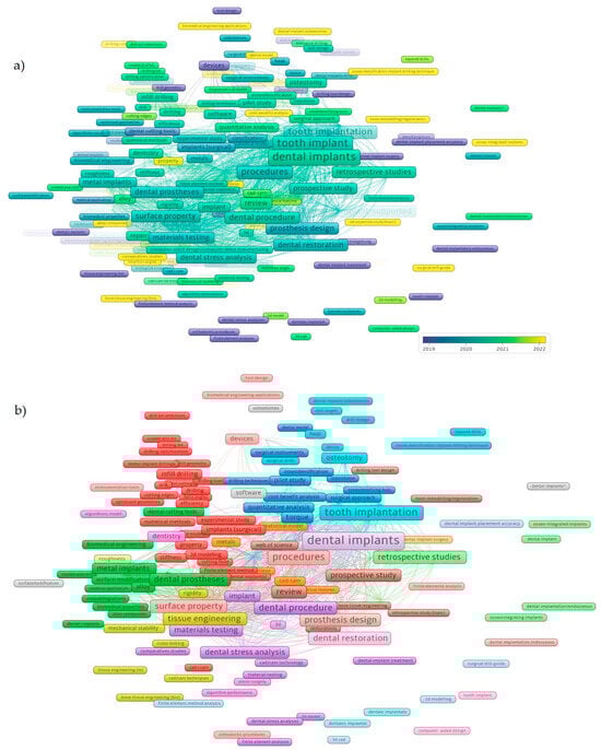 The overlay visualization of word cloud based on the keywords related to osseodensification technique and instrumentation occurring in the research publications from 2019 to the present (according to Scopus, ScienceDirect, and PubMed): (a) categorized by years; (b) categorized by clusters.